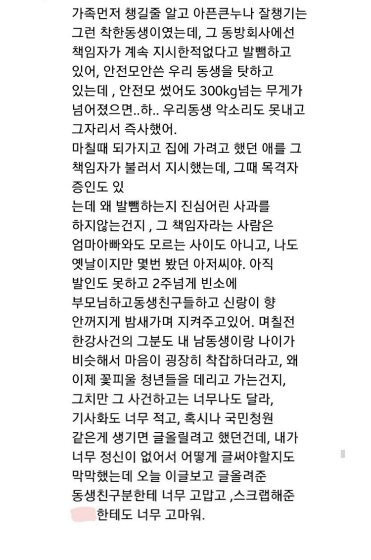 부디 철저한 조사를 통해 사고 원인 등을 규명하고, 산업 안전보건법 위반사항에 대해 엄중하게 처리 받길 바랍니다.