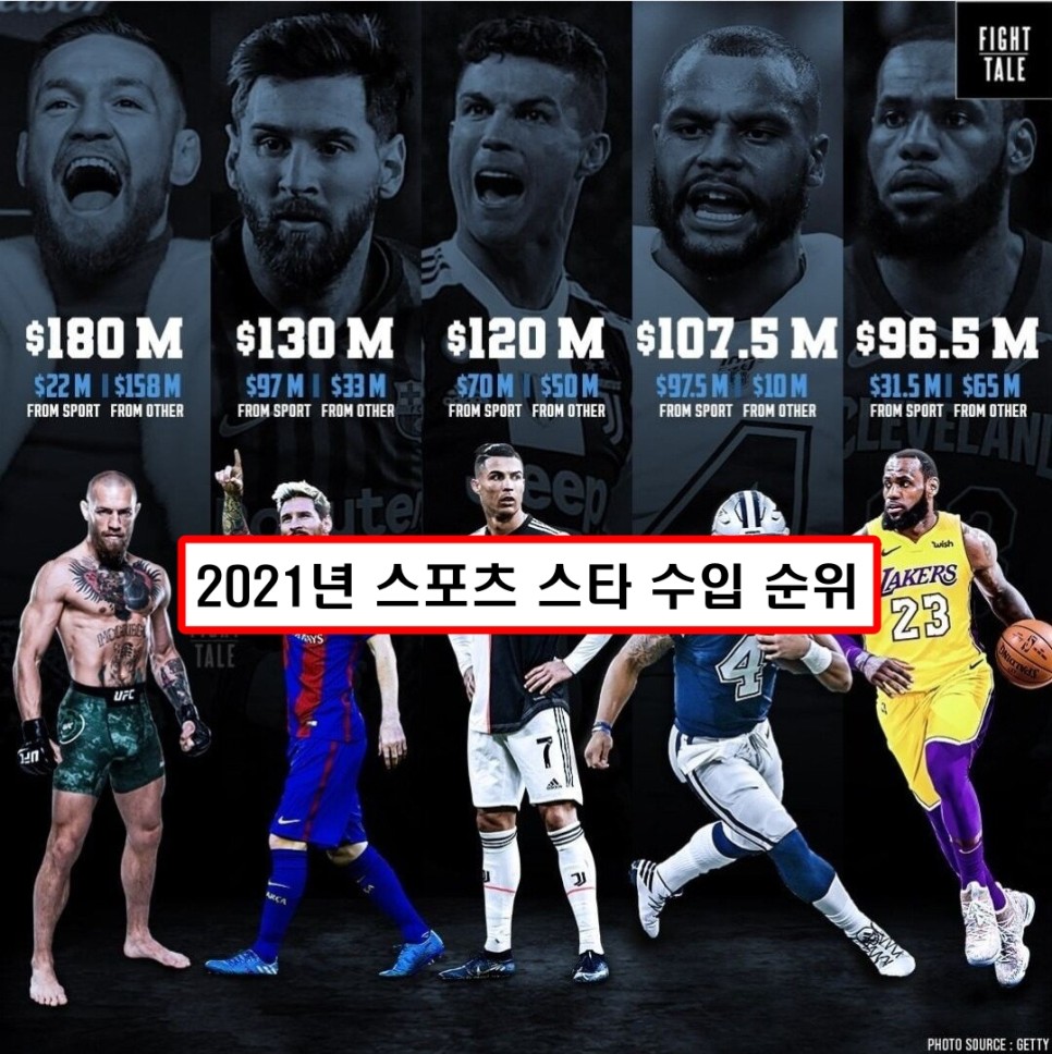 코너 맥그리거가 180m 수익을 올리며 2021년에 격투기 선수 최초로 포브스 선수 수입 1등 차지함.