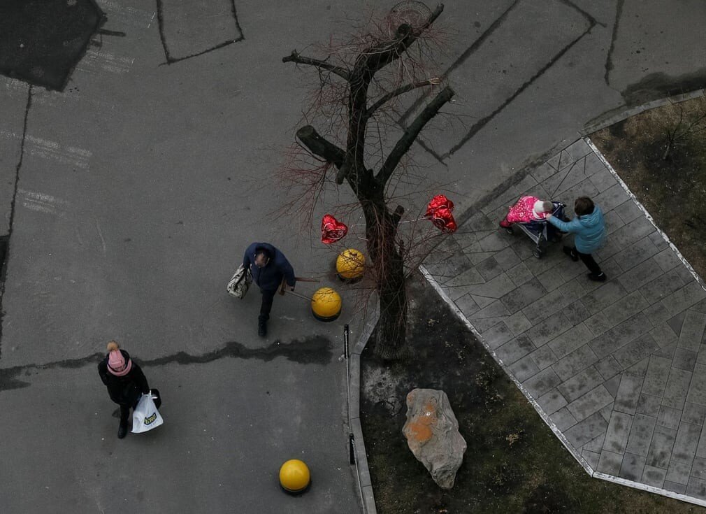 수도 키예프 중심부에서 자신들의 위치로 가고 있는 우크라이나 군인들.