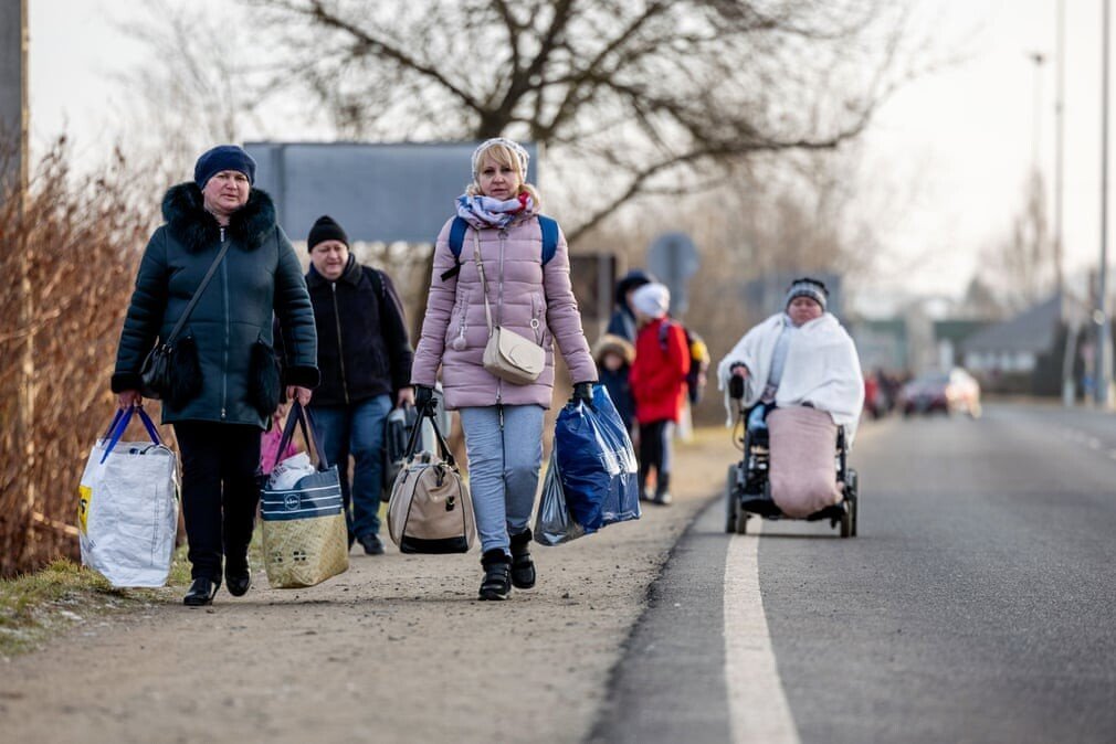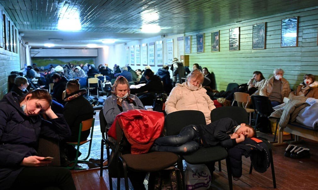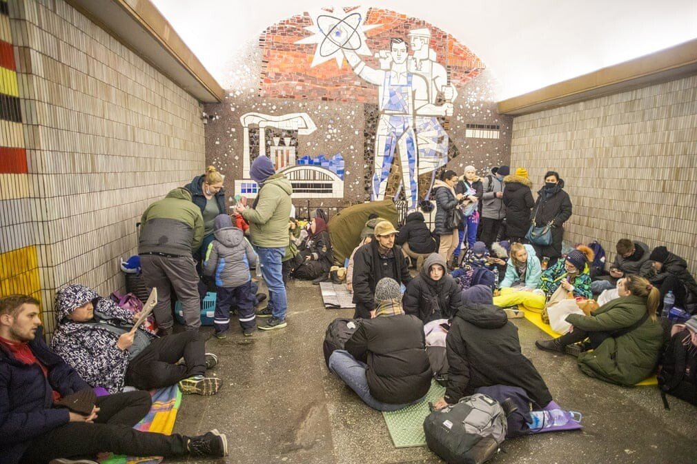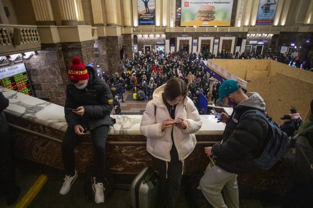 키예프 기차역에서 시민들이 핸드폰을 들여다보고 있다.