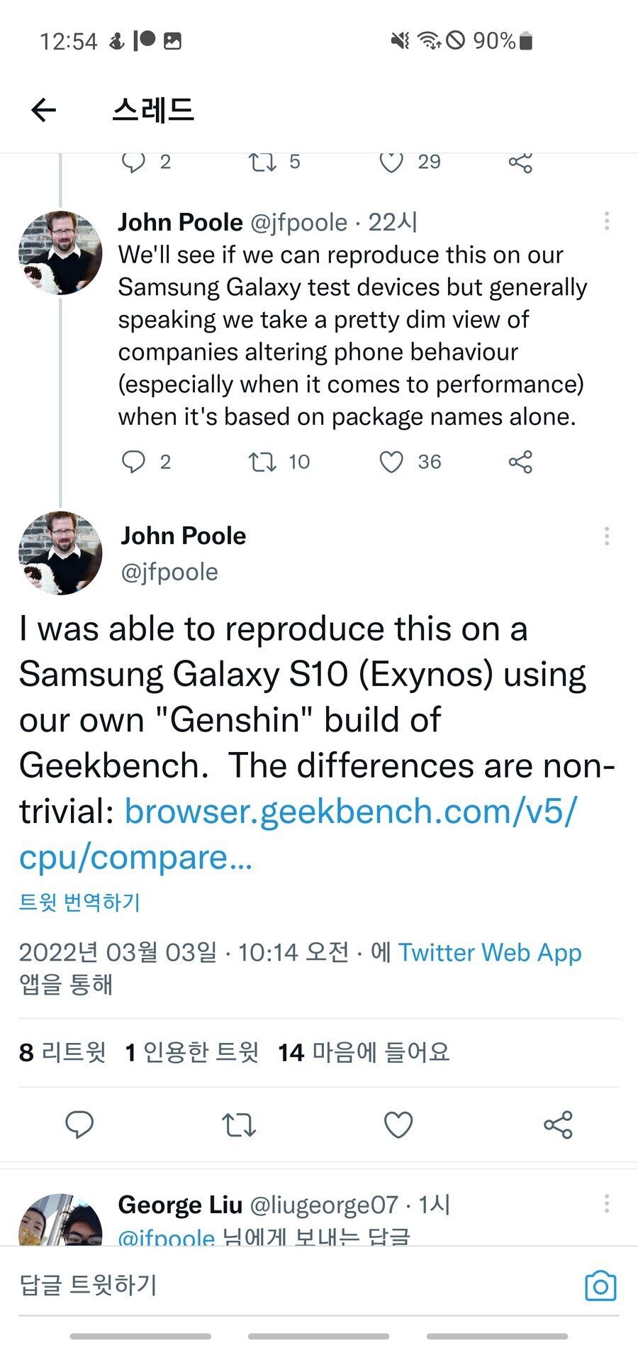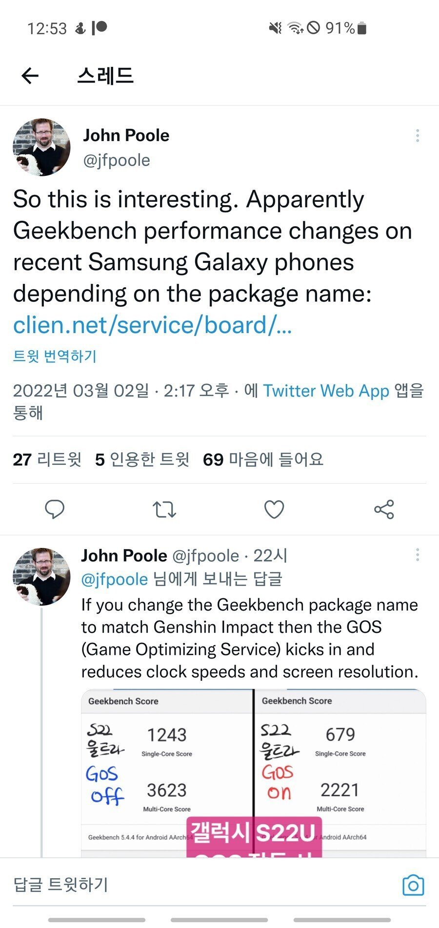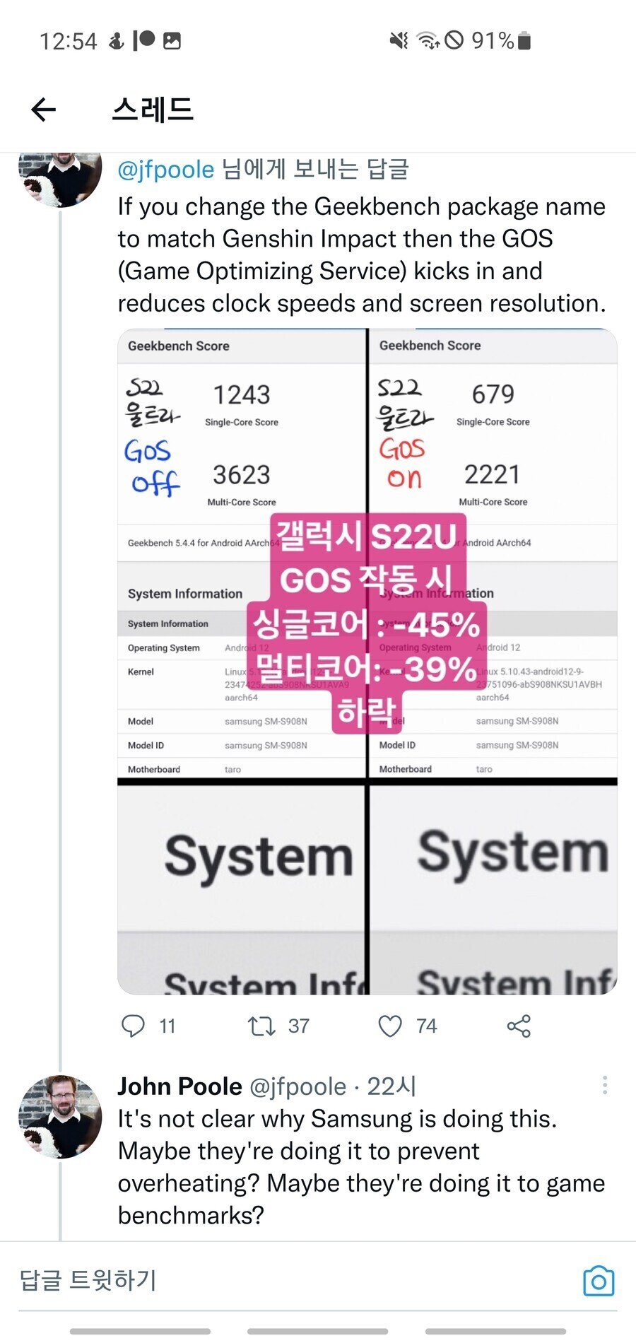 긱벤치의 개발자 John Poole은 삼성전자의 GOS 치팅에 대해 큰 관심을 가지고 있으며, 조만간 자사에서 직접 재시험을 돌릴것이라 발표했다. 또한, 재검했을때 GOS 치팅이 밝혀진다면 중국 스마트폰과 똑같은 취급인, 블랙리스트에 등재하겠다고 엄포를 놓았다