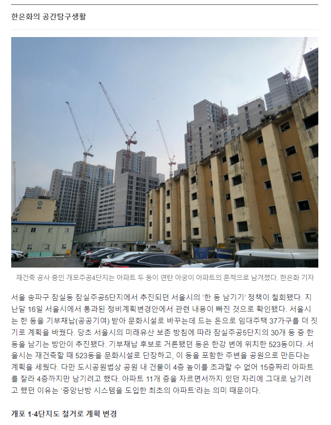 ━ 한은화의 공간탐구생활 서울 송파구 잠실동 잠실주공5단지에서 추진되던 서울시의 ‘한 동 남기기’ 정책이 철회됐다. 지난달 16일 서울시에서 통과된 정비계획변경안에서 관련 내용이 빠진